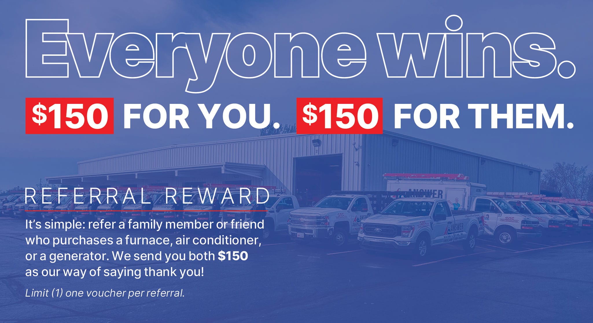 Referral Referral for NEW EQUIPMENT only! "*" indicates required fields Who Did You Refer?Name* First Last Phone*Email* Do they need a call from us?* Yes No What are their current needs?Your InformationName* First Last Phone*Email* Address* Street Address Address Line 2 City State / Province / Region ZIP / Postal Code * RequiredThis field is hidden when viewing the formCompany Email for Referrals Administrative field: do not enter data hereThis field is hidden when viewing the formNo Reply Email Administrative field: do not enter data here Need HVAC Service? Contact the experts at Answer Heating & Cooling. Call us at 989-407-0906! REQUEST SERVICE